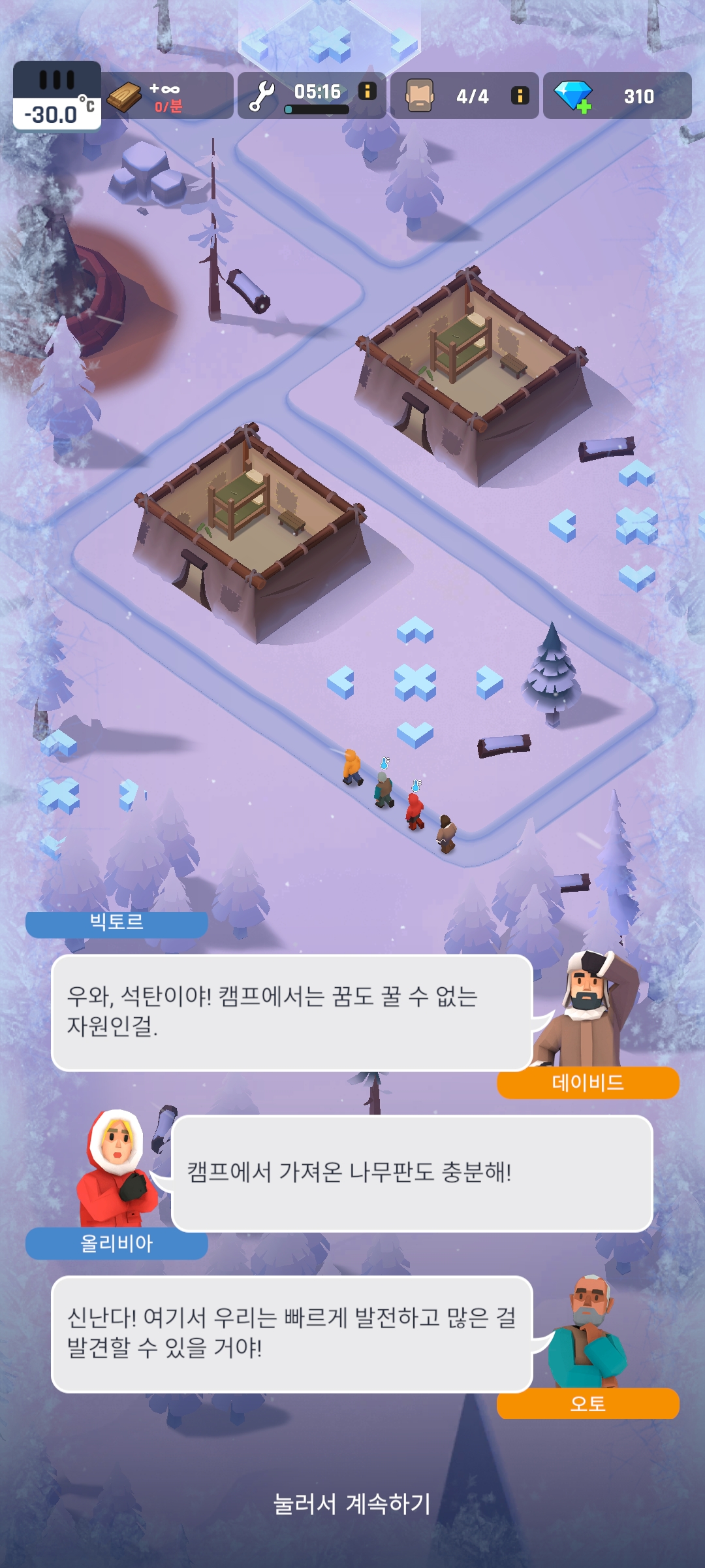 모인 자원으로 새로운 건물을 짓고, 또 새로운 자원을 생산해 내고, 쉼터를 더욱 건설하여 생존자들을 더 많이 모으면서 마을을 발전시켜 나가는 것이죠.